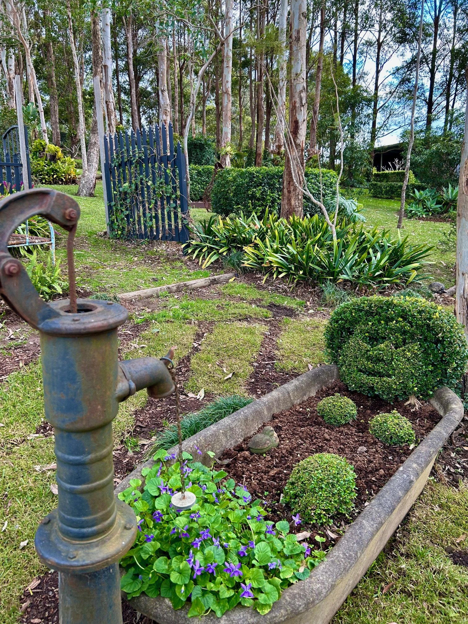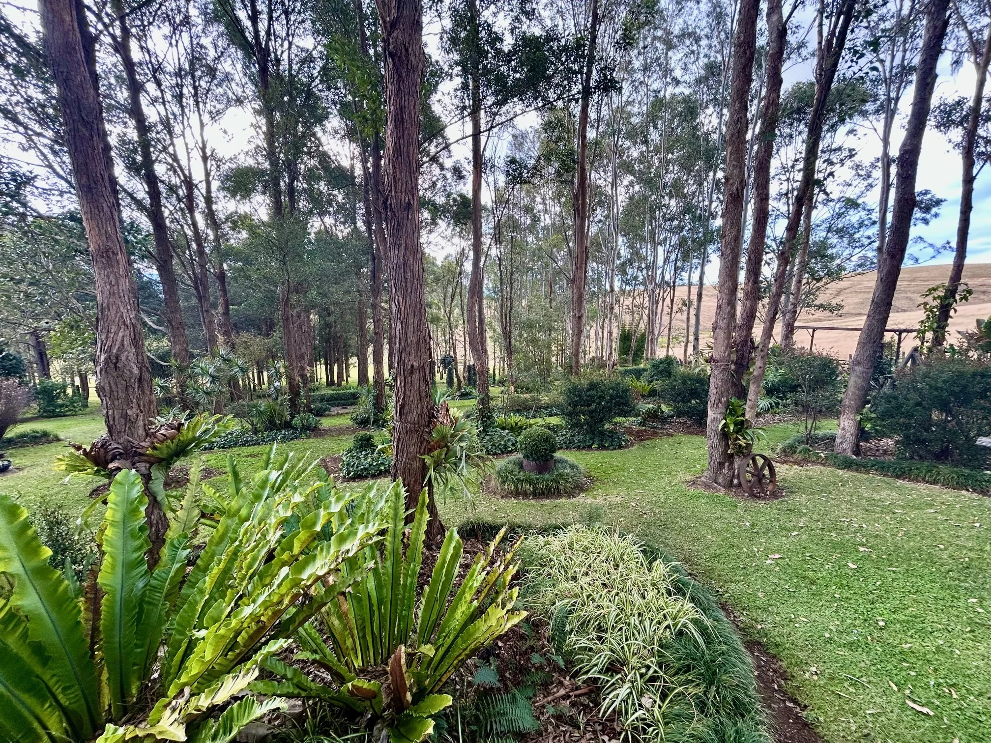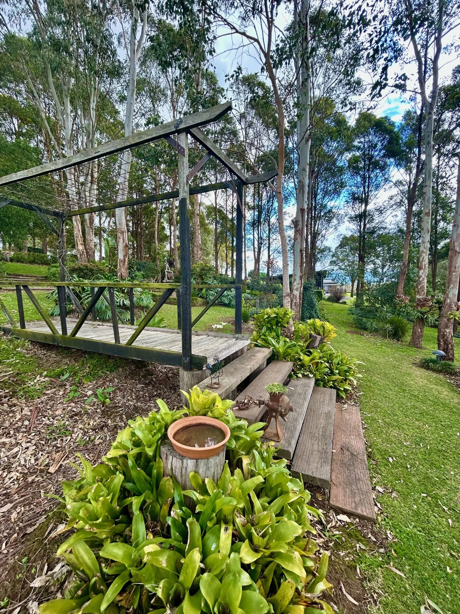 Amongst the rows of the former turpentine plantation, Carol and Michael have cultivated a serpentine garden filled with shade-loving plants and whimsical handmade metal sculptures. Keep an eye out for the “lady” in the bathtub, bonnet-wearing turtles, horseshoe ballerinas, and an artist’s easel tucked among the greenery. A striking hillside garden of Westringia topiaries flanks a grand railway sleeper staircase, offering sweeping views—Berry to the north and Bomaderry to the south.